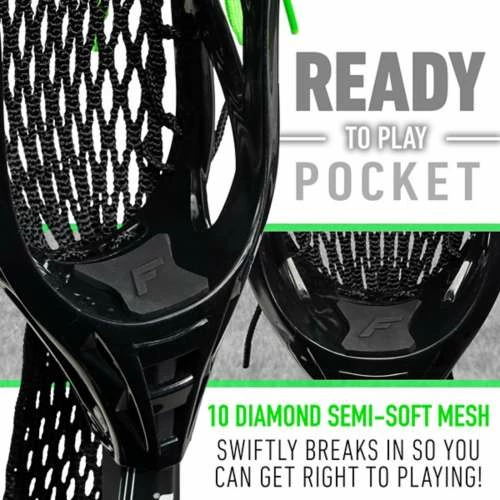READY TO PLAY POCKET: Pocket made with standard 10 Diamond semi-soft mesh that swiftly breaks in so you can get right to playing! This semi soft mesh also allows for a deeper pocket and more ball control when cradling